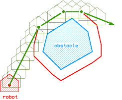 ... and finally, the robot's path is found as a simple polyline connecting its centre of gravity to the target location via some of the vertices of the obstacle's extent. |