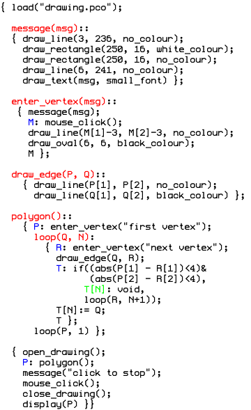 We will be using a graphical extension of Pico based on the original Pico. The syntax is slightly different and more sophisticated (to enhance readability) and a set of simple 2D primitives is provided. As an example we include code and screen dump for the entry of a polygon: